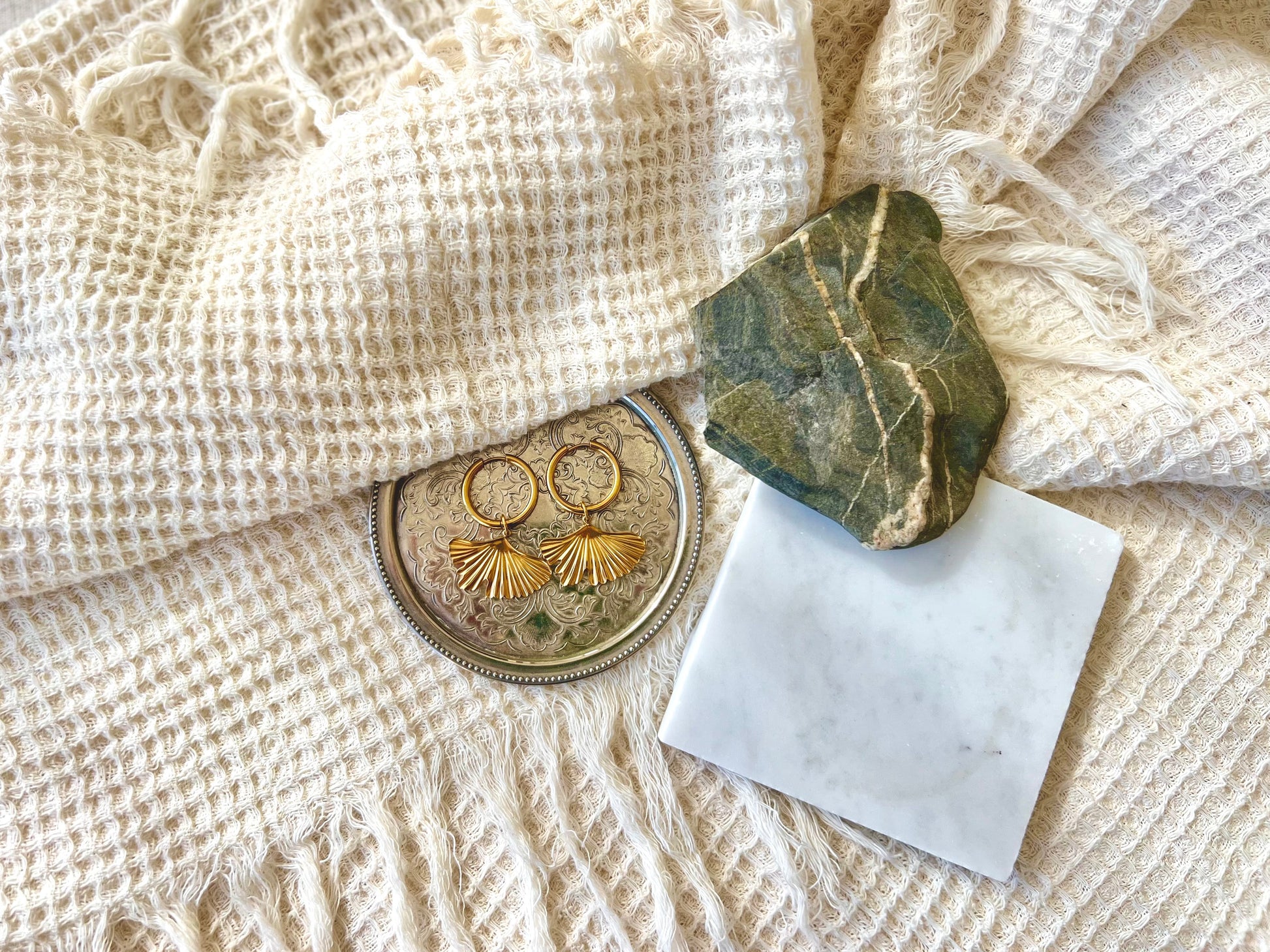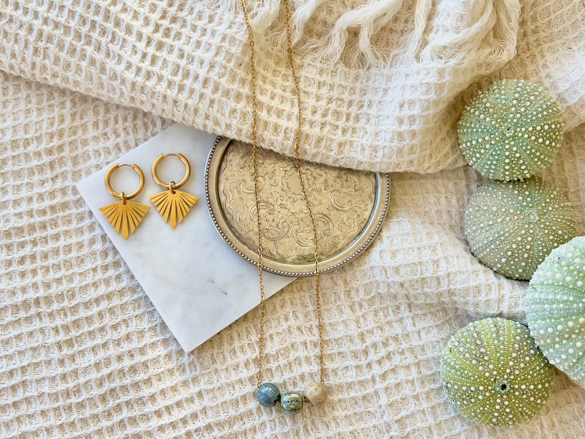 Gold stainless steel hoops with art deco style charm. 2.5mm x 10mm. 2.5 16